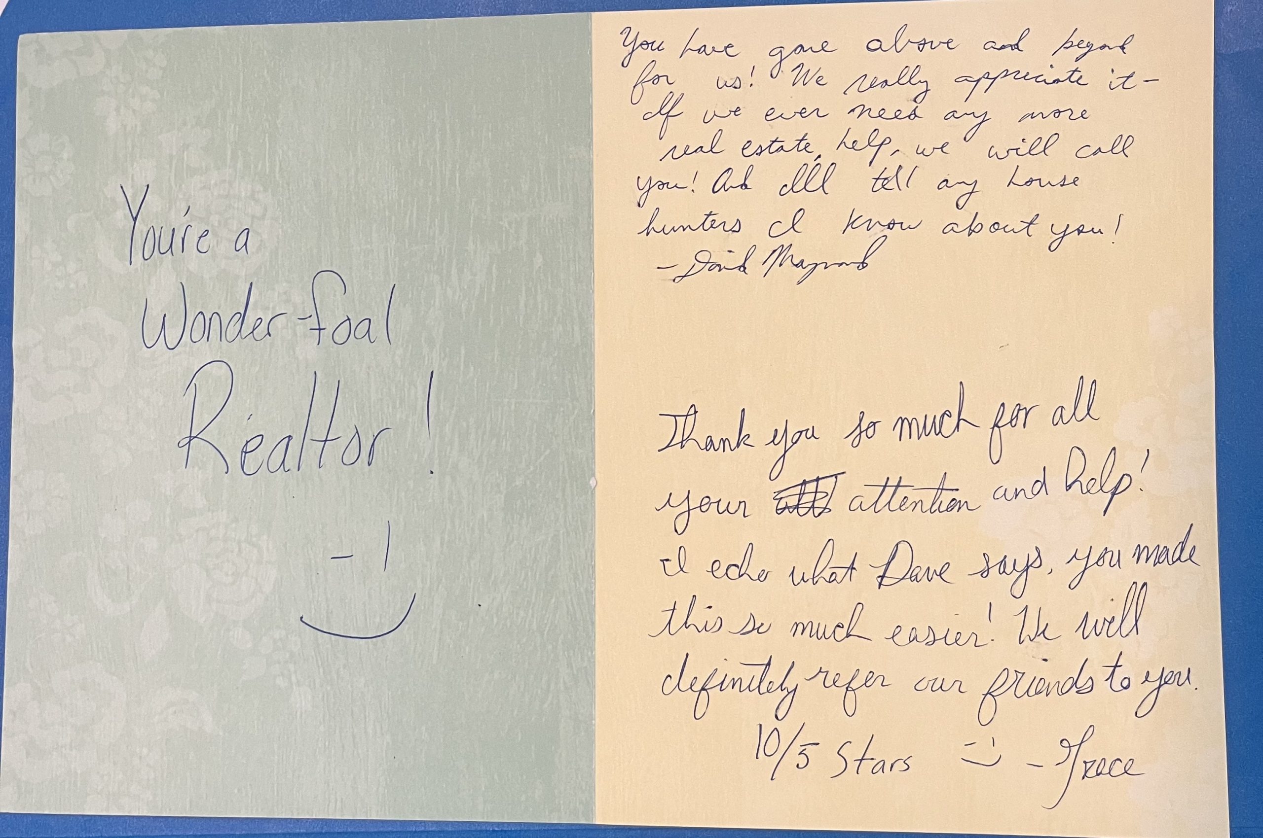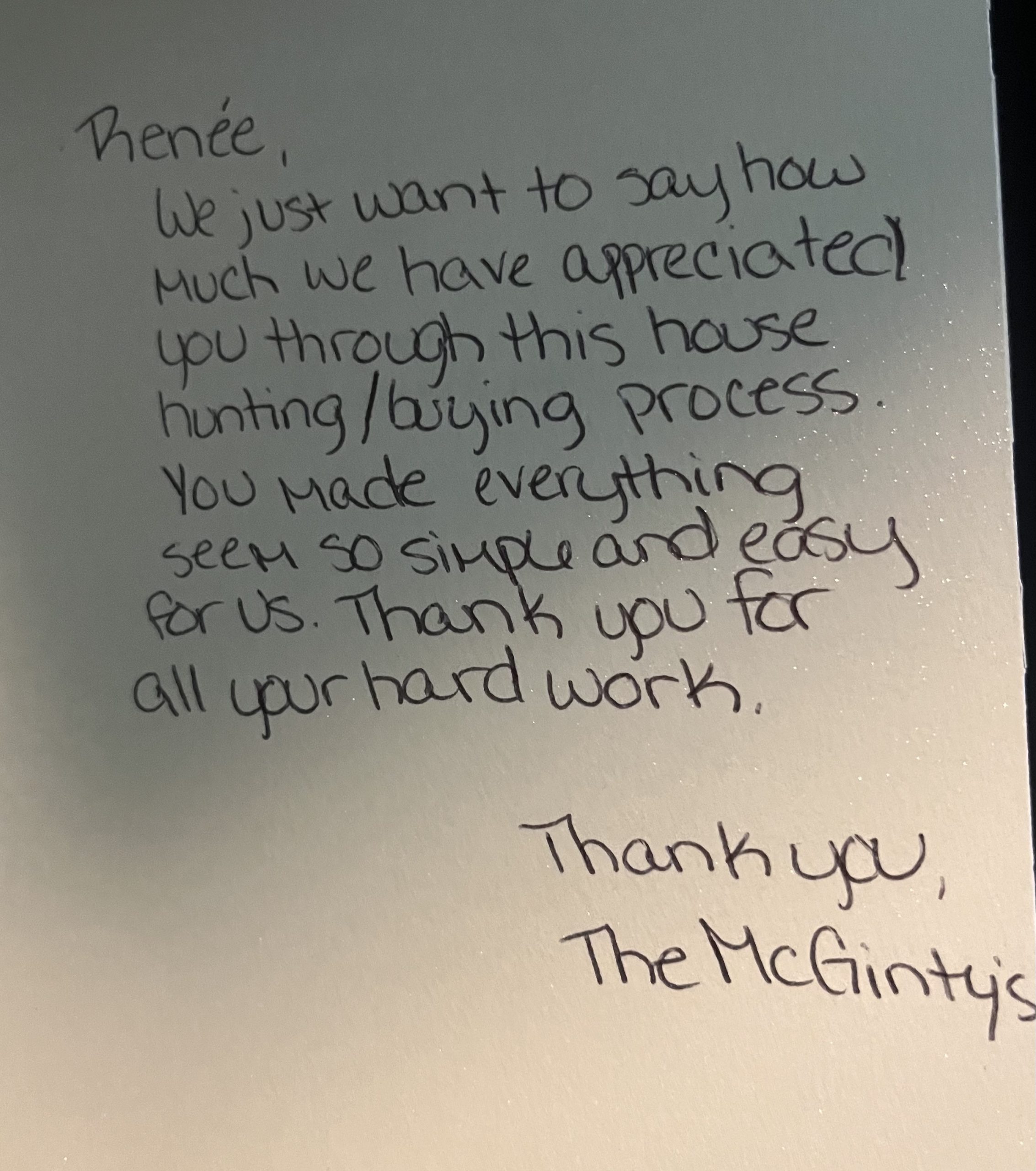 "We just want to say how much we have appreciated you through this house hunting/buying process. You made everything seem so simple and easy for us. Thank you for all your hard work."